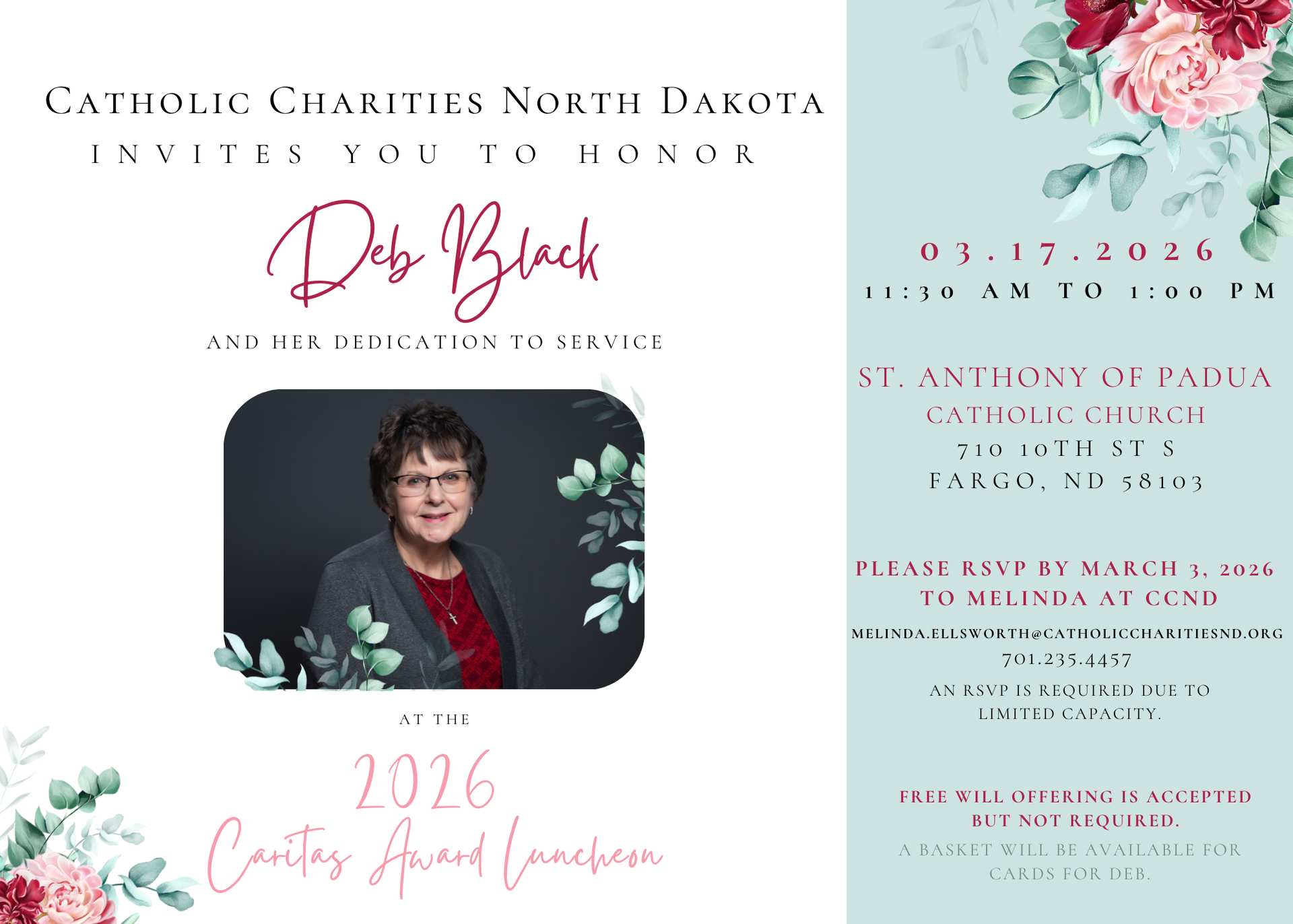 To RSVP for the Caritas Luncheon, please RSVP to Melinda at Catholic Charities North Dakota, melinda.ellsworth@catholiccharitiesnd.org by March 3, 2026. An RSVP is required to limited capacity.