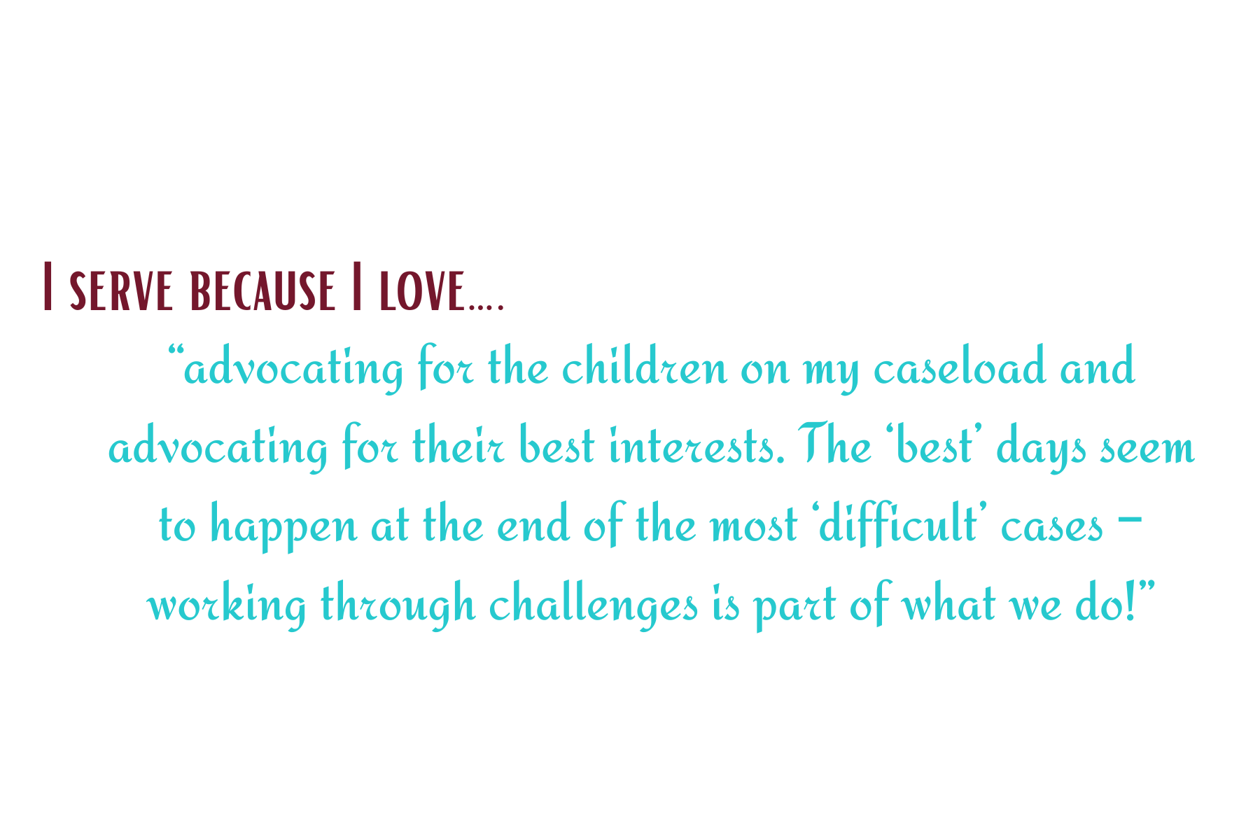 - I serve because… “I am motivated to continue to provide the best for the children and families I serve to ensure that each child gets a chance for normalcy during the remainder of their childhood. No child should grow up in foster care!”