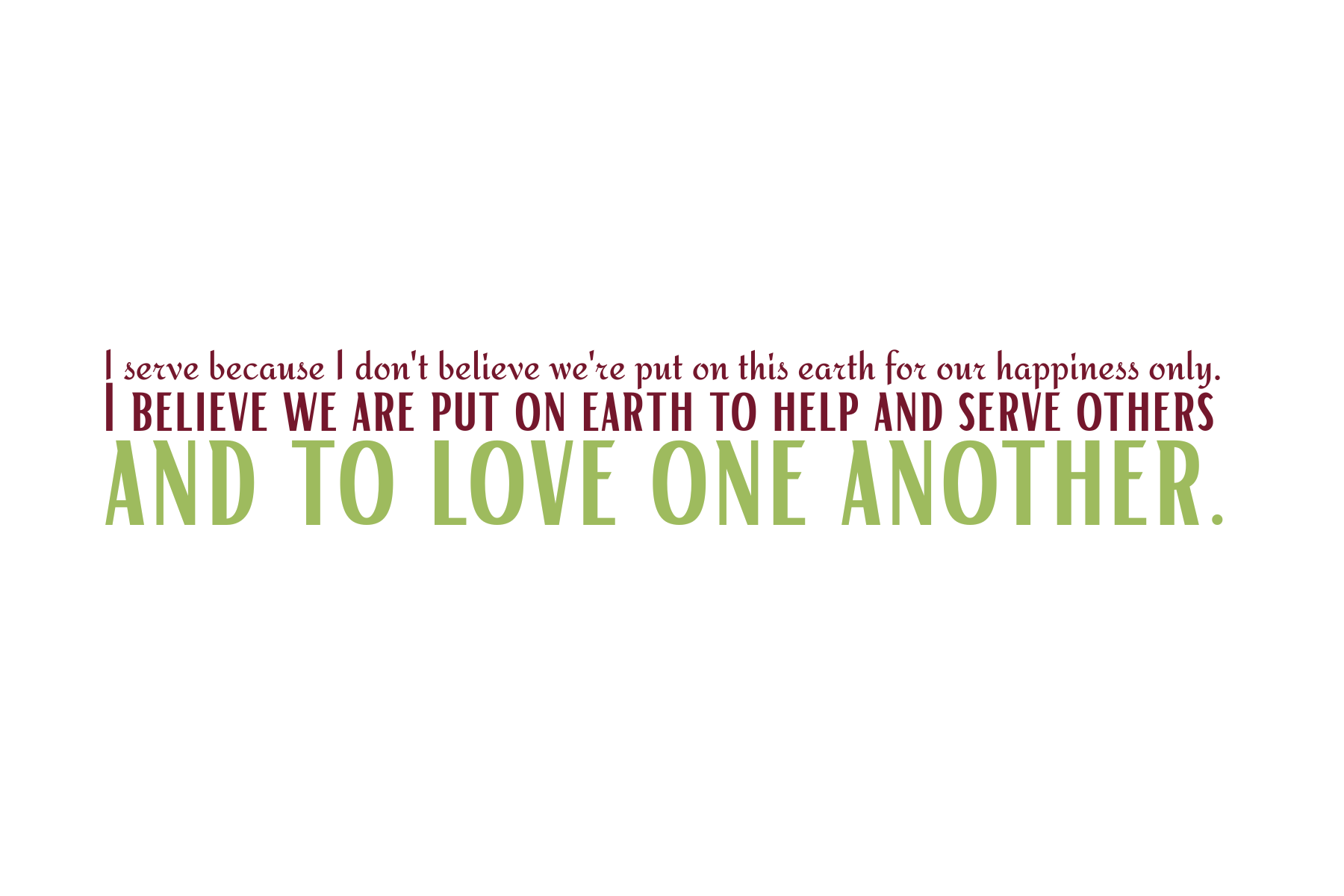 - I serve because I don't believe we're put on this earth for our happiness only. I believe we are put on earth to help and serve others and to love one another.
